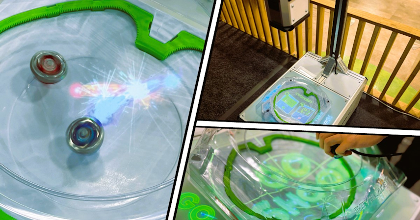 高速回転するベイブレード(コマ)の動きをセンサーが感知し、その軌跡を鮮やかな光のプロジェクションマッピングで映し出します。歴代最速のベイブレードシリーズである『BEYBLADE X』のスピード感が際立つ演出で、まるで漫画やアニメの世界が現実になったかのような次世代バトルが体験できます。