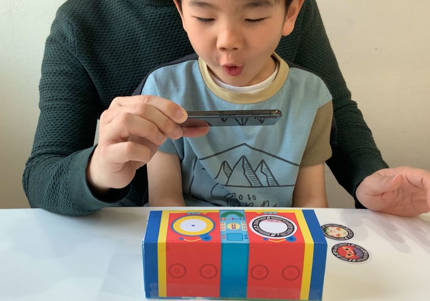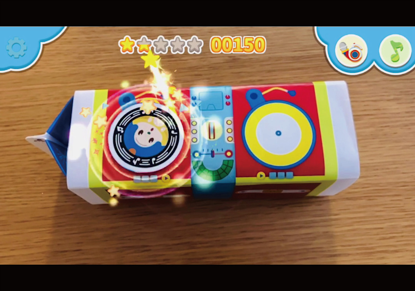 専用のクラフトキットで作ったDJセットの2つのターンテーブルに、さまざまな「音」が録音された「オトッペレコード」や、身近な音を自分で録音した「ろくおんレコード」を置いてアプリで読み込むと、AR技術によってスマホ画面の中でレコードが回り出し、指でタッチするとスクラッチやミックスなどのDJプレイが体験できます。